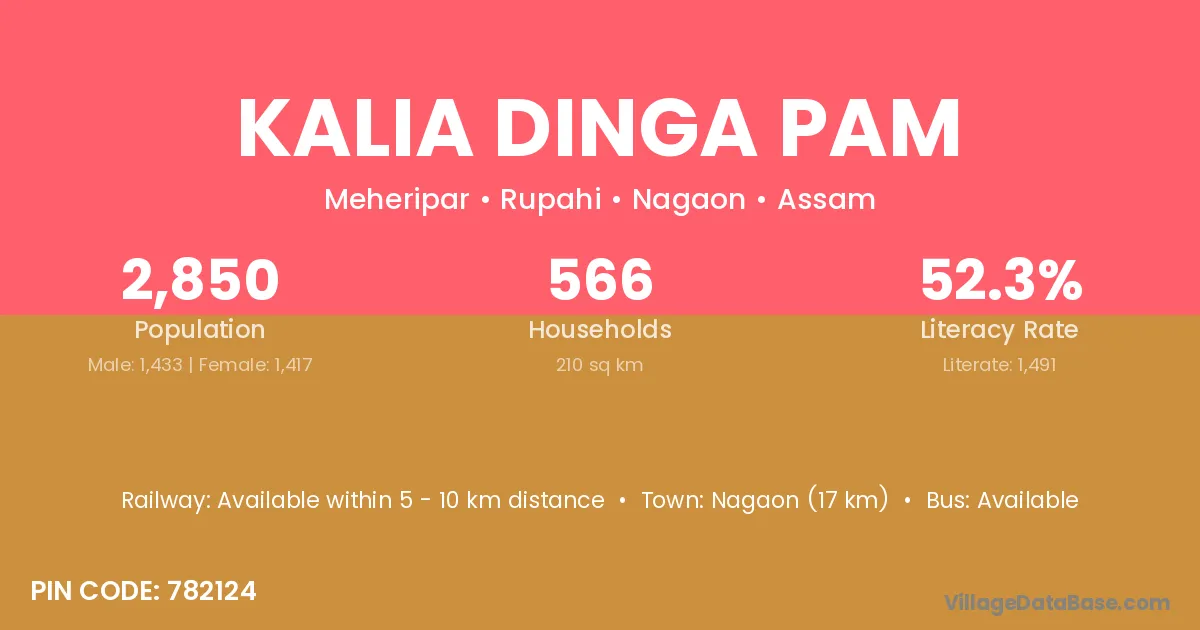 Nagaon (17 km) is the nearest town to Kalia Dinga Pam village for major economic activities and is located approximately 17 km away.