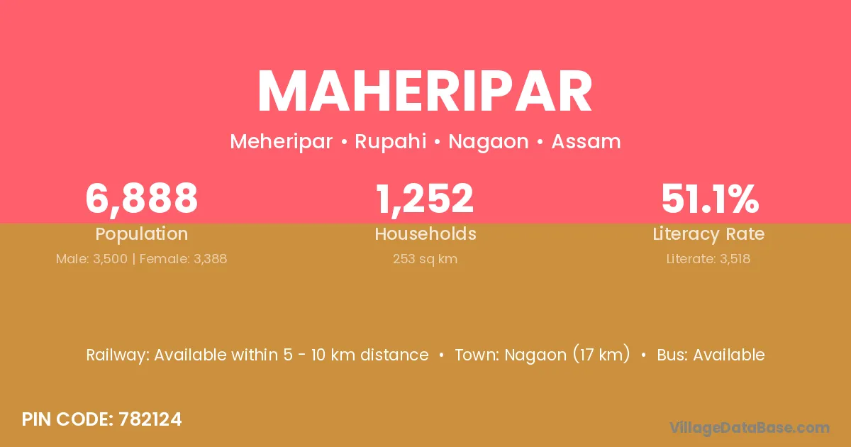 Nagaon (17 km) is the nearest town to Maheripar village for major economic activities and is located approximately 17 km away.
