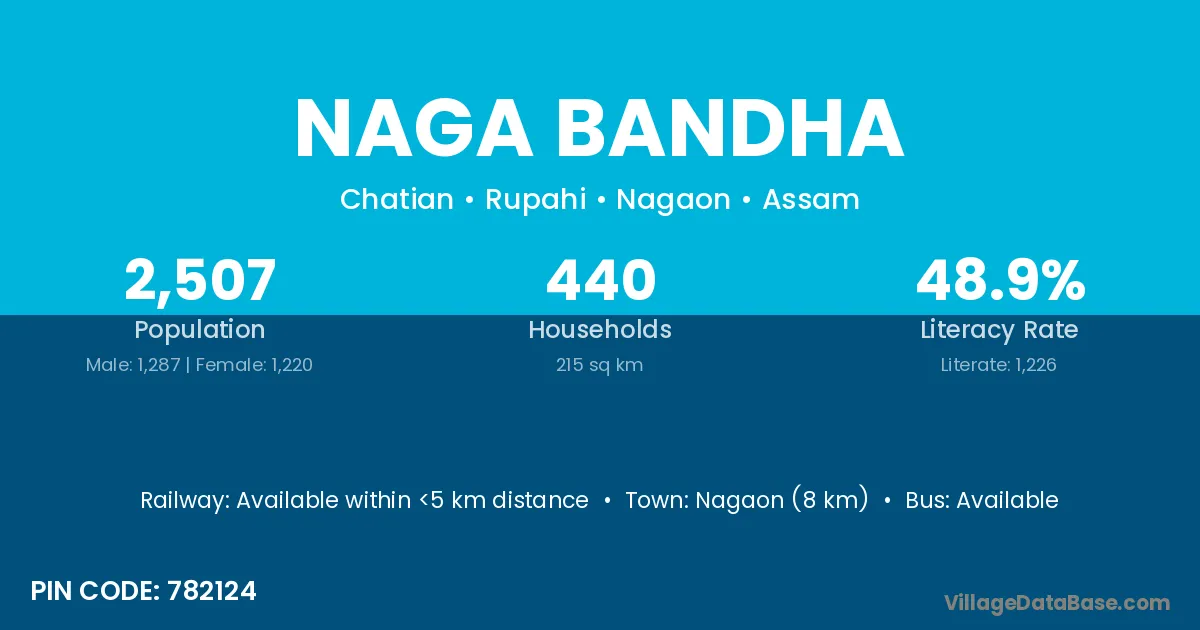Nagaon (8 km) is the nearest town to Naga Bandha village for major economic activities and is located approximately 8 km away.