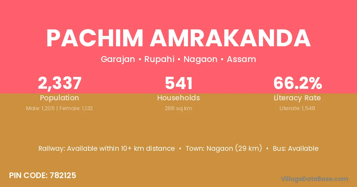 Nagaon (29 km) is the nearest town to Pachim Amrakanda village for major economic activities and is located approximately 29 km away.
