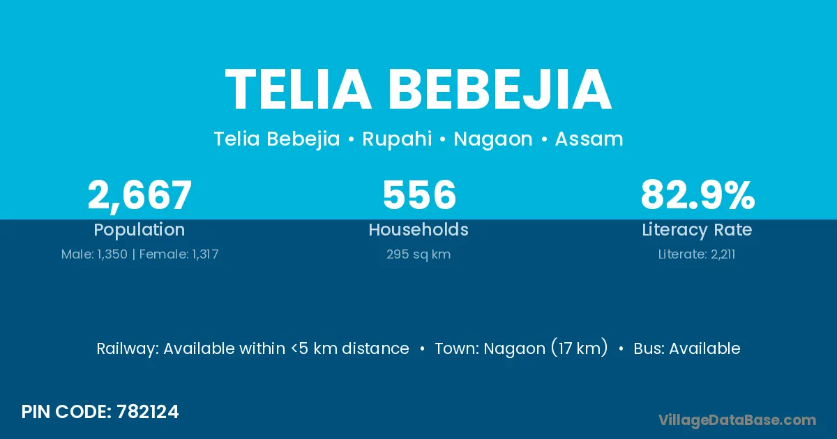 Nagaon (17 km) is the nearest town to Telia Bebejia village for major economic activities and is located approximately 17 km away.
