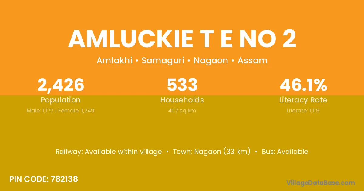 Nagaon (33 km) is the nearest town to Amluckie T E No 2 village for major economic activities and is located approximately 33 km away.