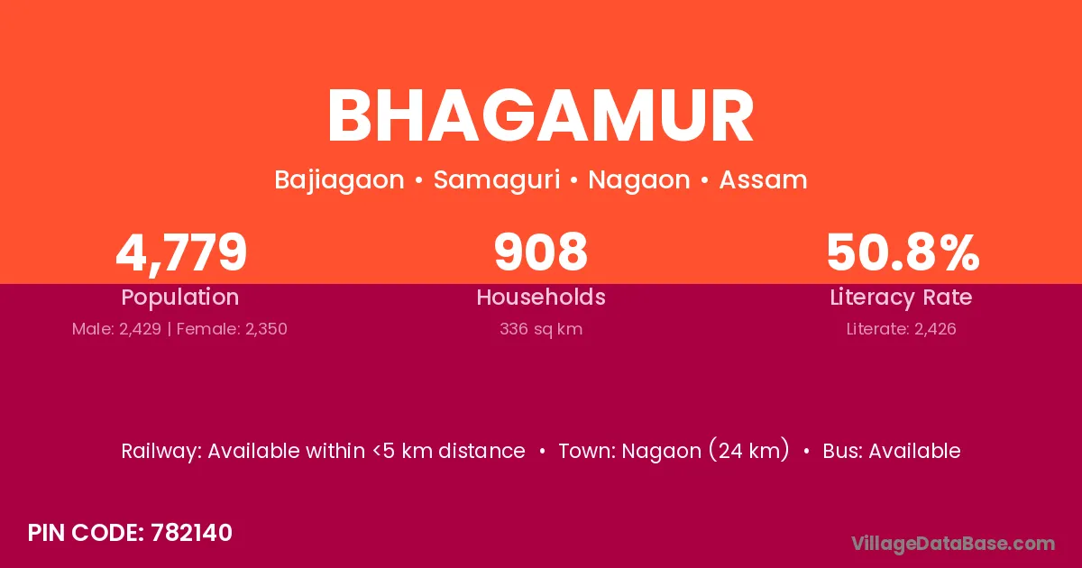 Nagaon (24 km) is the nearest town to Bhagamur village for major economic activities and is located approximately 24 km away.