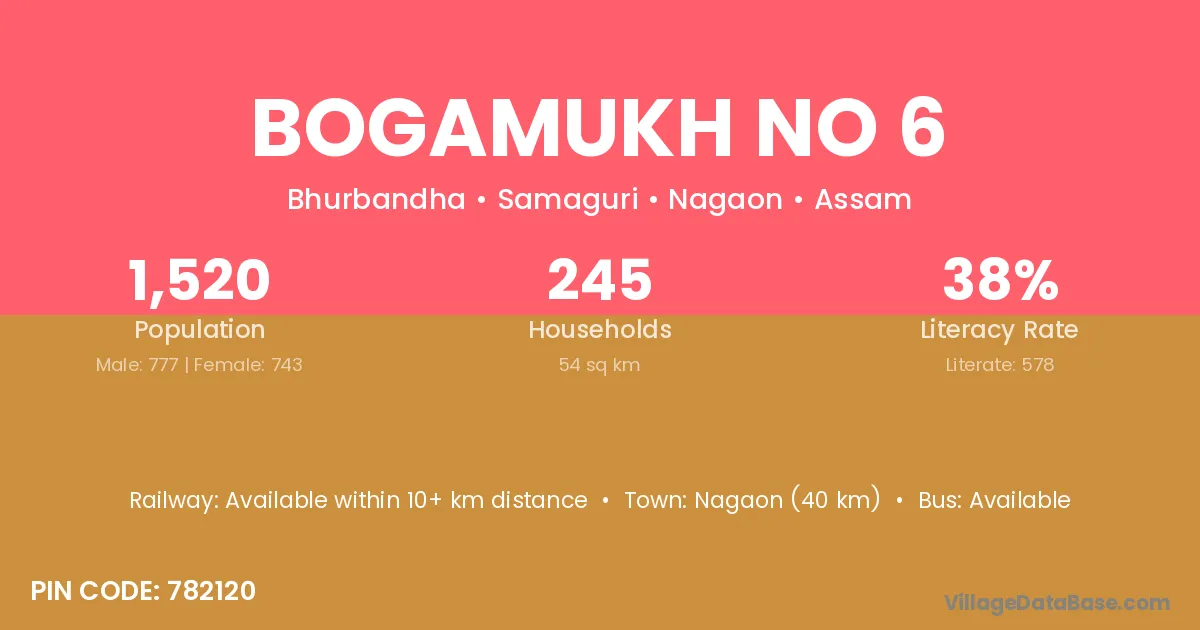 Bogamukh No 6 village has a total population of 1,520 people, of which 777 are males and 743 are females.