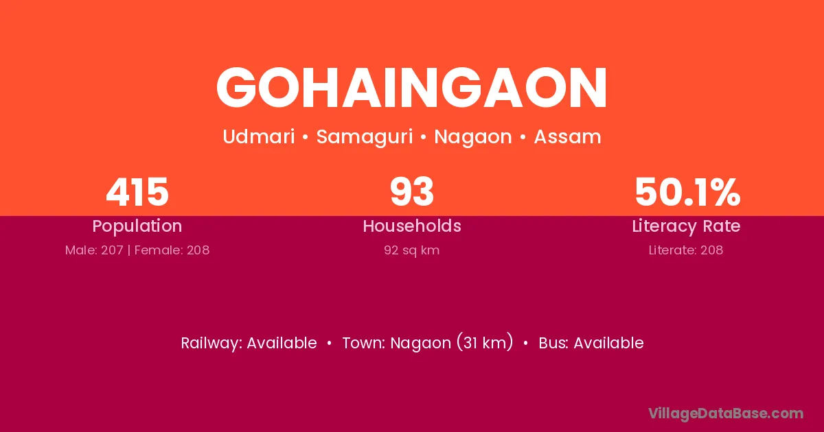 Nagaon (31 km) is the nearest town to Gohaingaon village for major economic activities and is located approximately 31 km away.