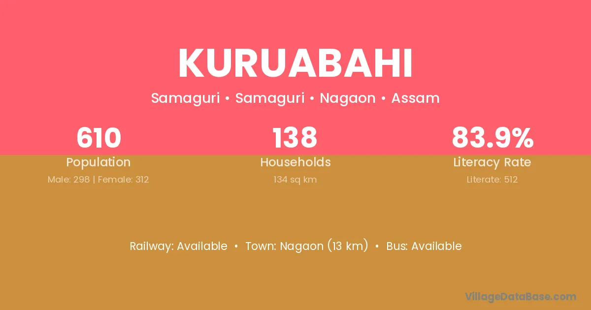 Nagaon (13 km) is the nearest town to Kuruabahi village for major economic activities and is located approximately 13 km away.