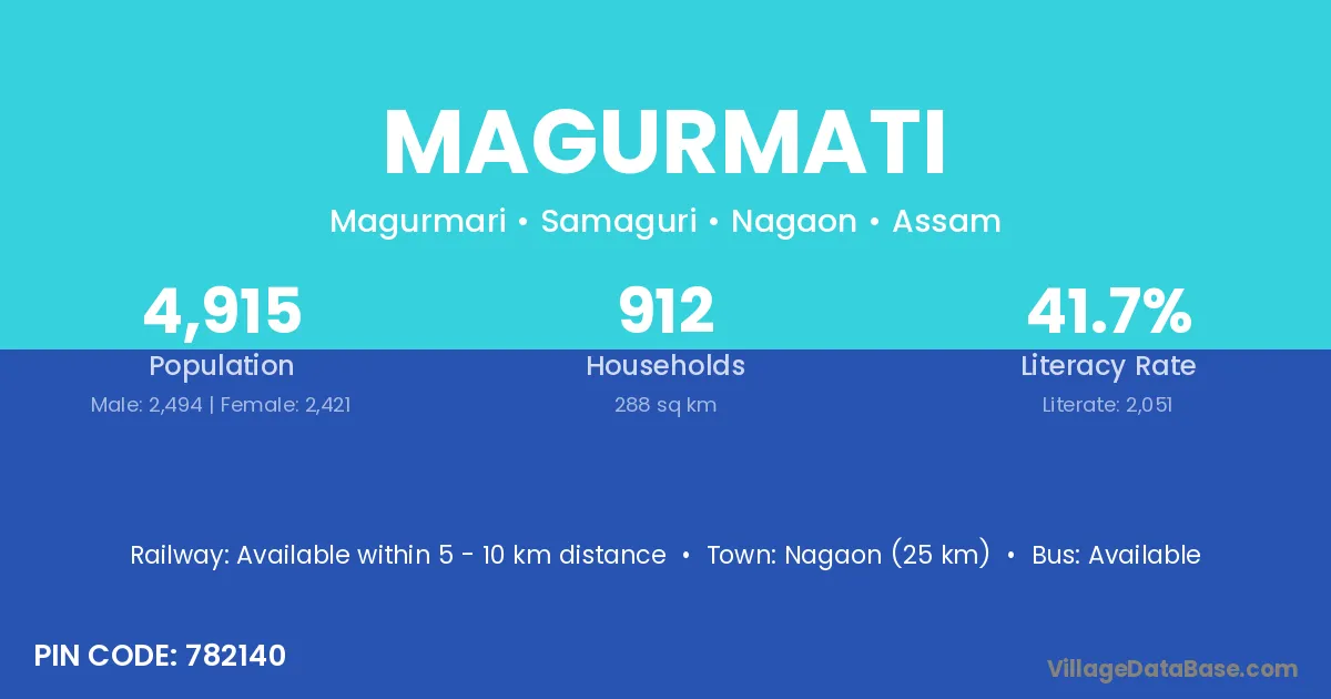 Nagaon (25 km) is the nearest town to Magurmati village for major economic activities and is located approximately 25 km away.