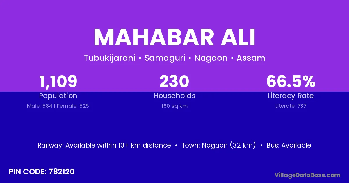 Nagaon (32 km) is the nearest town to Mahabar Ali village for major economic activities and is located approximately 32 km away.
