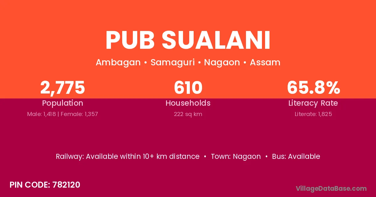 Pub Sualani village has a total population of 2,775 people, of which 1,418 are males and 1,357 are females.