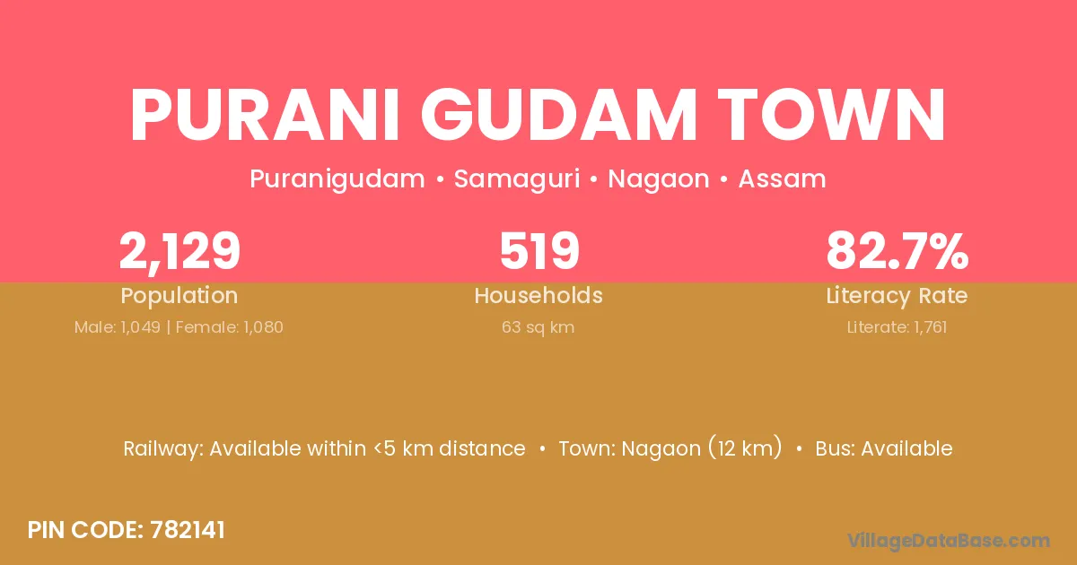 Nagaon (12 km) is the nearest town to Purani Gudam Town village for major economic activities and is located approximately 12 km away.