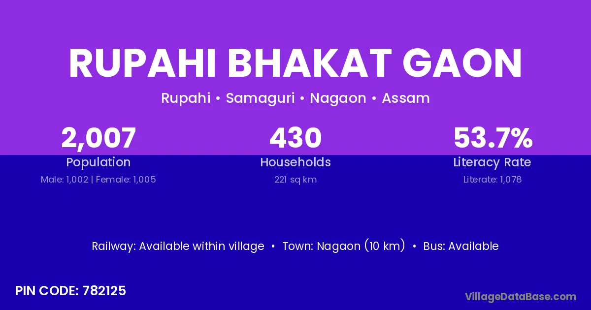 Rupahi Bhakat Gaon village has a total population of 2,007 people, of which 1,002 are males and 1,005 are females.