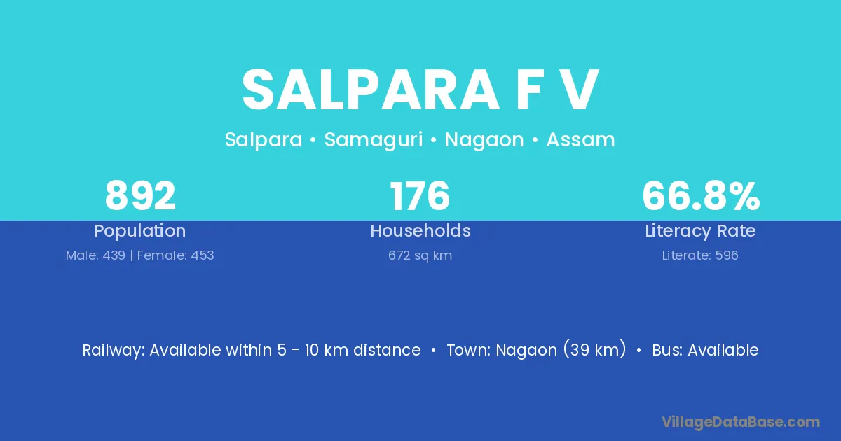 Nagaon (39 km) is the nearest town to Salpara F V village for major economic activities and is located approximately 39 km away.