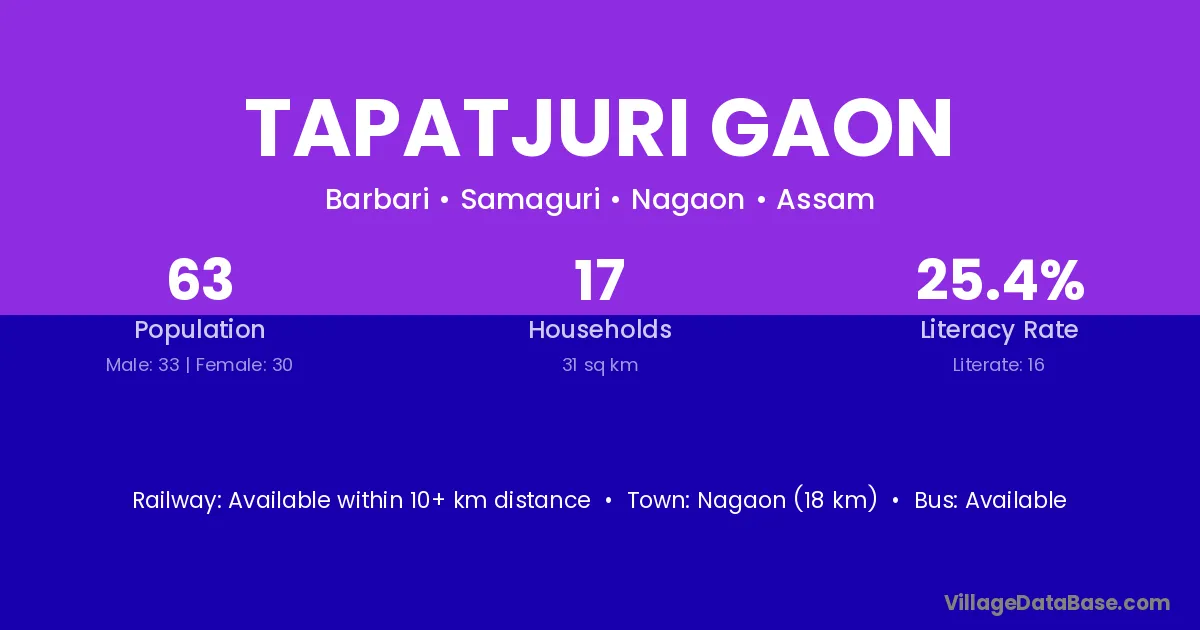 Nagaon (18 km) is the nearest town to Tapatjuri Gaon village for major economic activities and is located approximately 18 km away.