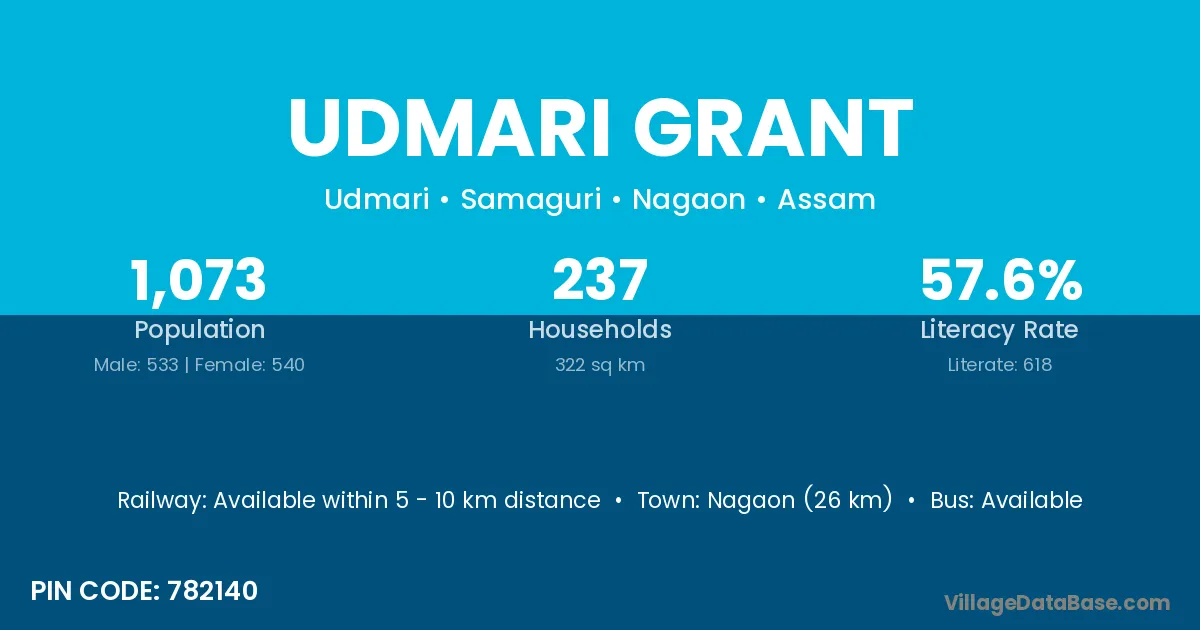 Nagaon (26 km) is the nearest town to Udmari Grant village for major economic activities and is located approximately 26 km away.