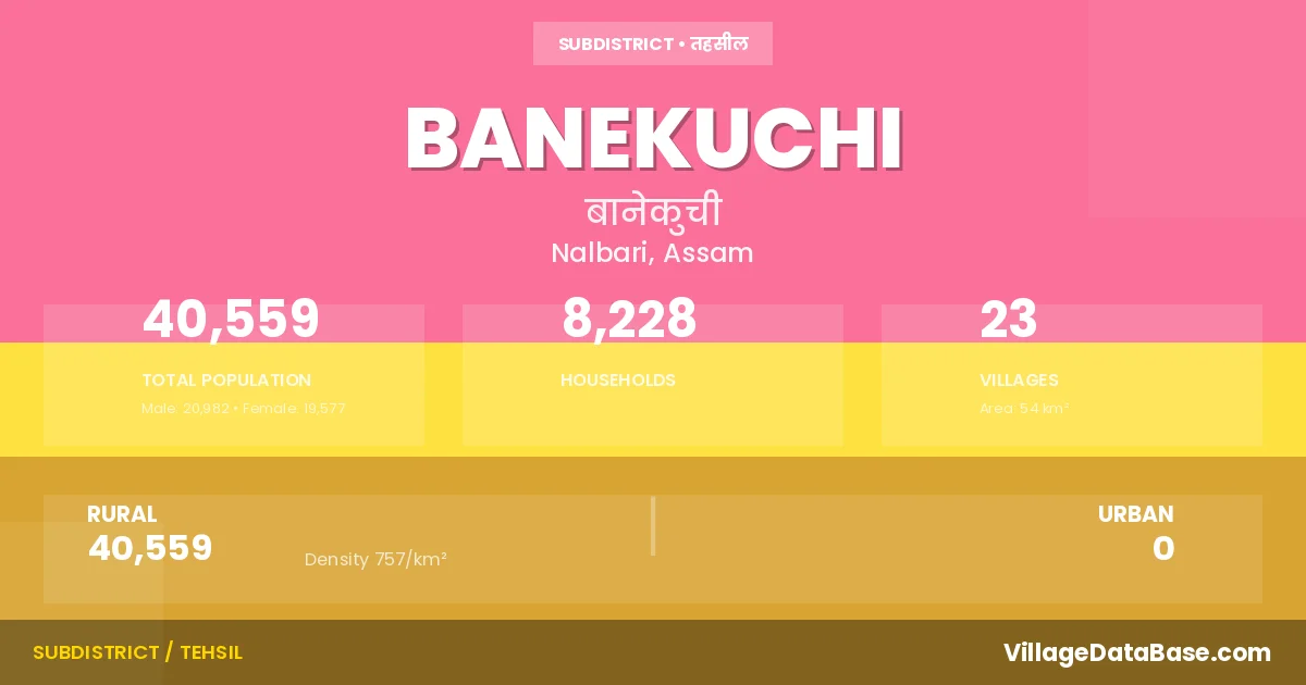 According to the 2011 census The total area of Banekuchi Subdivision is 54 km², with a population of 40559 people. The population density is 757 inhabitants per square kilometre, and there are approximately 8228 houses in the sub district.