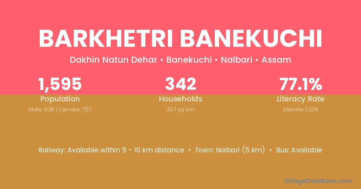 Barkhetri Banekuchi village has a total population of 1,595 people, of which 838 are males and 757 are females.