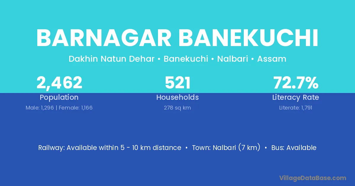 Nalbari (7 km) is the nearest town to Barnagar Banekuchi village for major economic activities and is located approximately 7 km away.