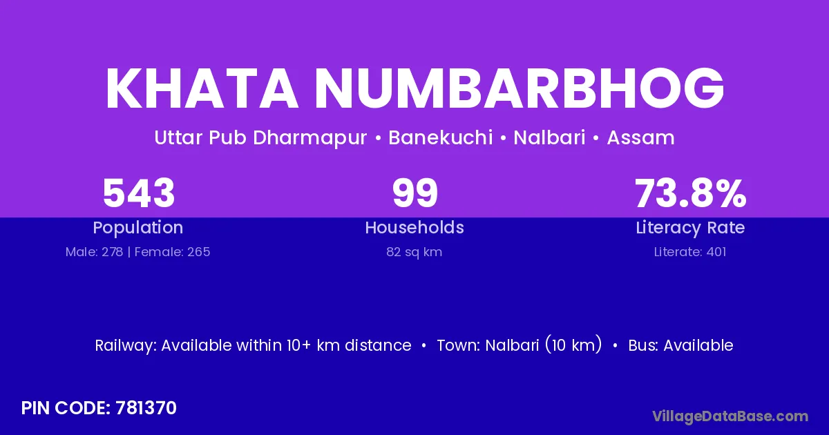 Nalbari (10 km) is the nearest town to Khata Numbarbhog village for major economic activities and is located approximately 10 km away.