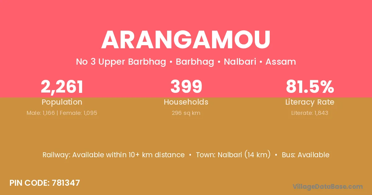 Nalbari (14 km) is the nearest town to Arangamou village for major economic activities and is located approximately 14 km away.