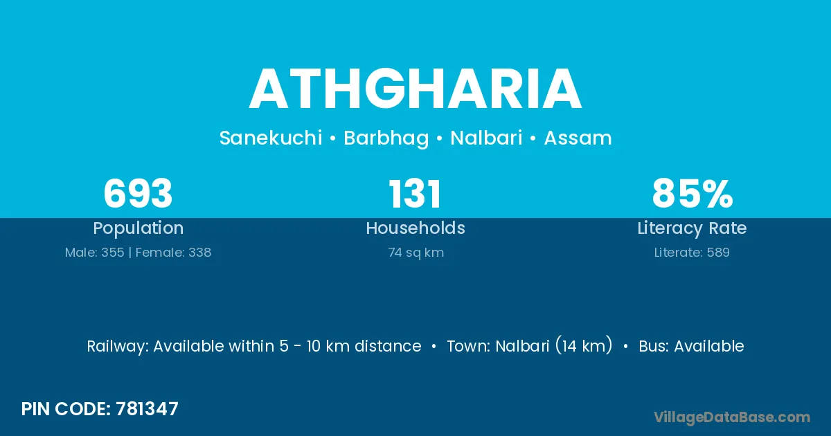 Nalbari (14 km) is the nearest town to Athgharia village for major economic activities and is located approximately 14 km away.