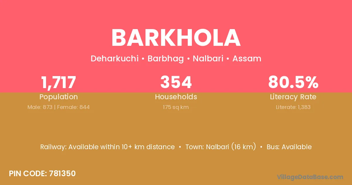 Nalbari (16 km) is the nearest town to Barkhola village for major economic activities and is located approximately 16 km away.