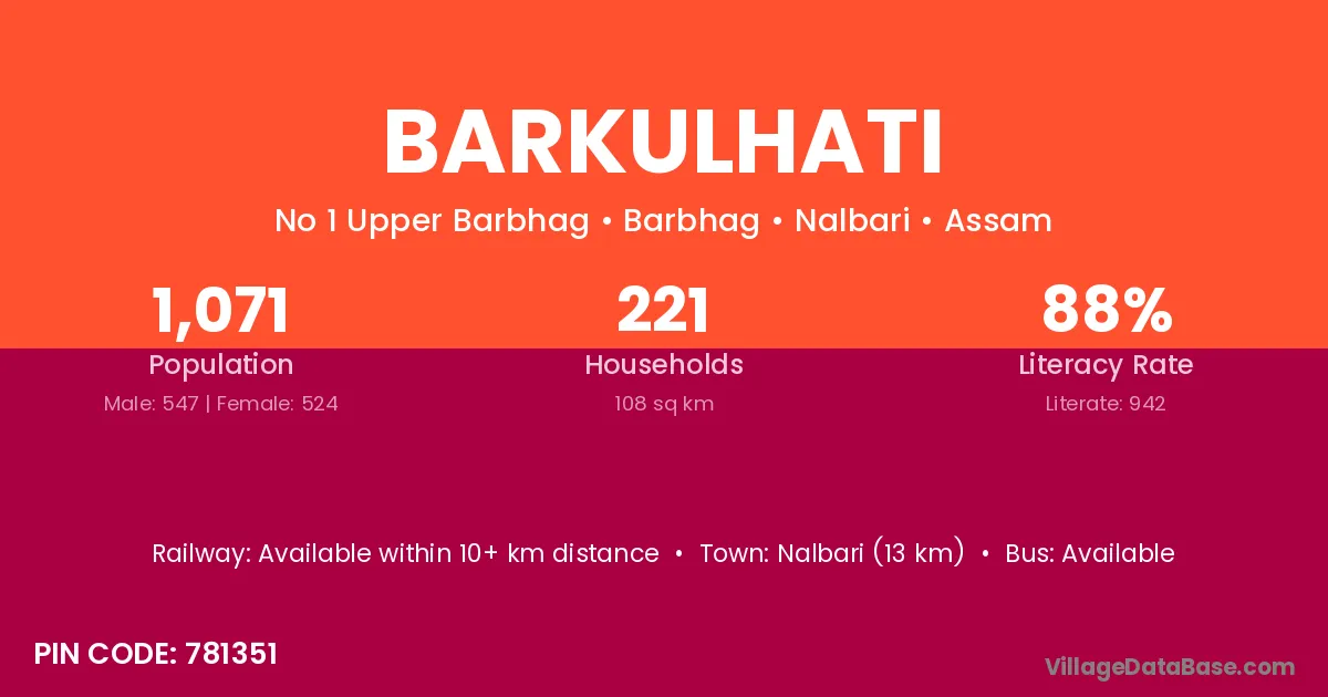 Nalbari (13 km) is the nearest town to Barkulhati village for major economic activities and is located approximately 13 km away.