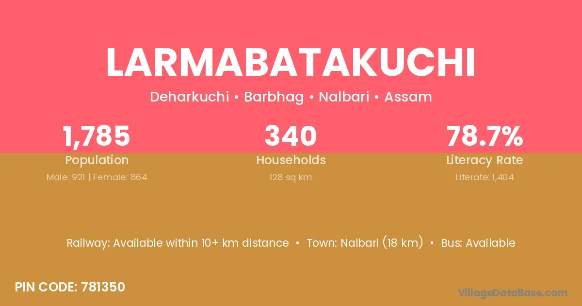 Nalbari (18 km) is the nearest town to Larmabatakuchi village for major economic activities and is located approximately 18 km away.