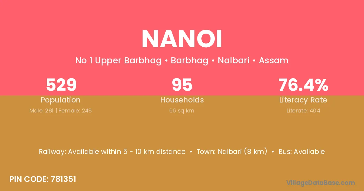 Nalbari (8 km) is the nearest town to Nanoi village for major economic activities and is located approximately 8 km away.