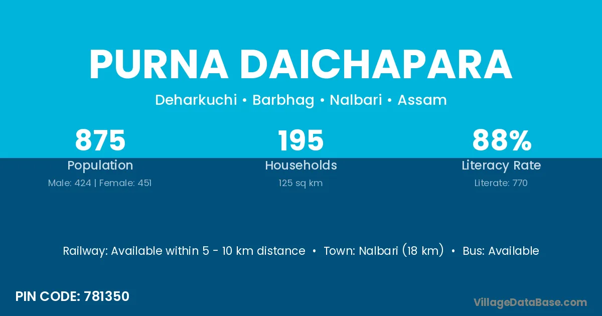 Nalbari (18 km) is the nearest town to Purna Daichapara village for major economic activities and is located approximately 18 km away.