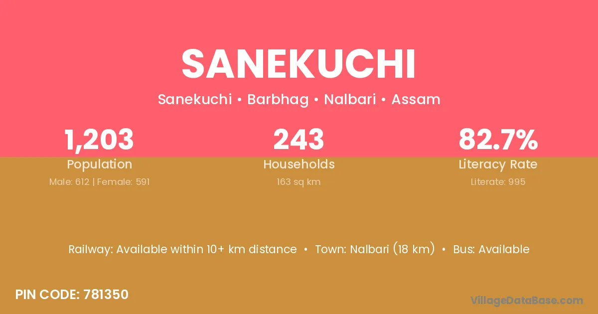 Nalbari (18 km) is the nearest town to Sanekuchi village for major economic activities and is located approximately 18 km away.