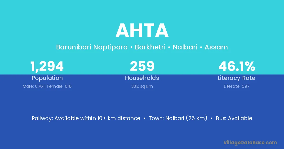 Nalbari (25 km) is the nearest town to Ahta village for major economic activities and is located approximately 25 km away.