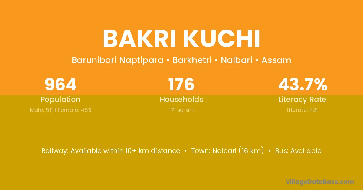 Nalbari (16 km) is the nearest town to Bakri Kuchi village for major economic activities and is located approximately 16 km away.