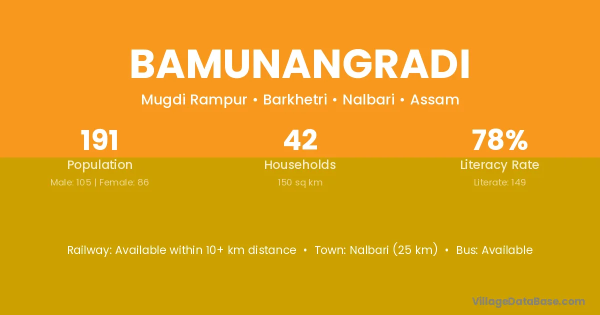 Nalbari (25 km) is the nearest town to Bamunangradi village for major economic activities and is located approximately 25 km away.