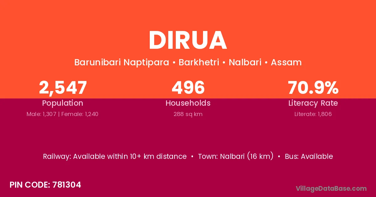 Nalbari (16 km) is the nearest town to Dirua village for major economic activities and is located approximately 16 km away.