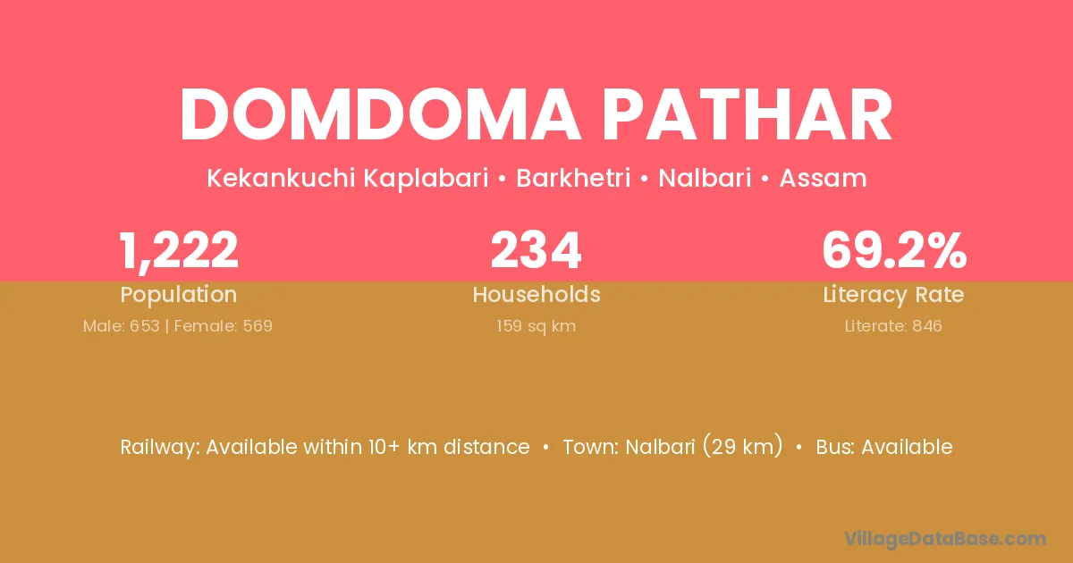 Nalbari (29 km) is the nearest town to Domdoma Pathar village for major economic activities and is located approximately 29 km away.