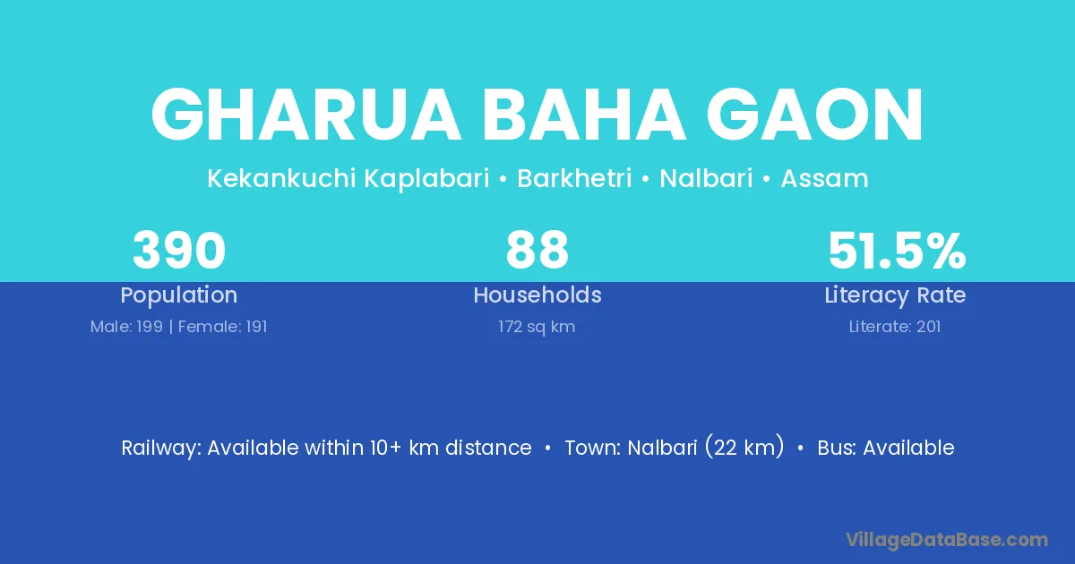 Nalbari (22 km) is the nearest town to Gharua Baha Gaon village for major economic activities and is located approximately 22 km away.