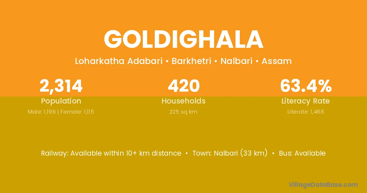 Nalbari (33 km) is the nearest town to Goldighala village for major economic activities and is located approximately 33 km away.