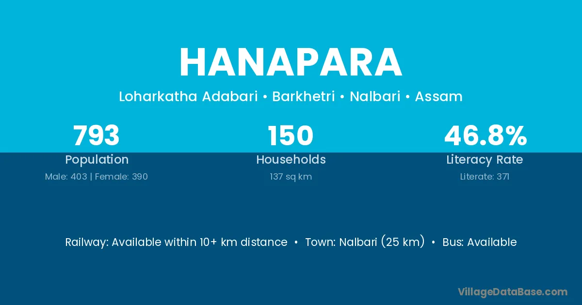 Nalbari (25 km) is the nearest town to Hanapara village for major economic activities and is located approximately 25 km away.