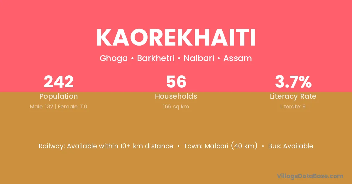 Malbari (40 km) is the nearest town to Kaorekhaiti village for major economic activities and is located approximately 40 km away.