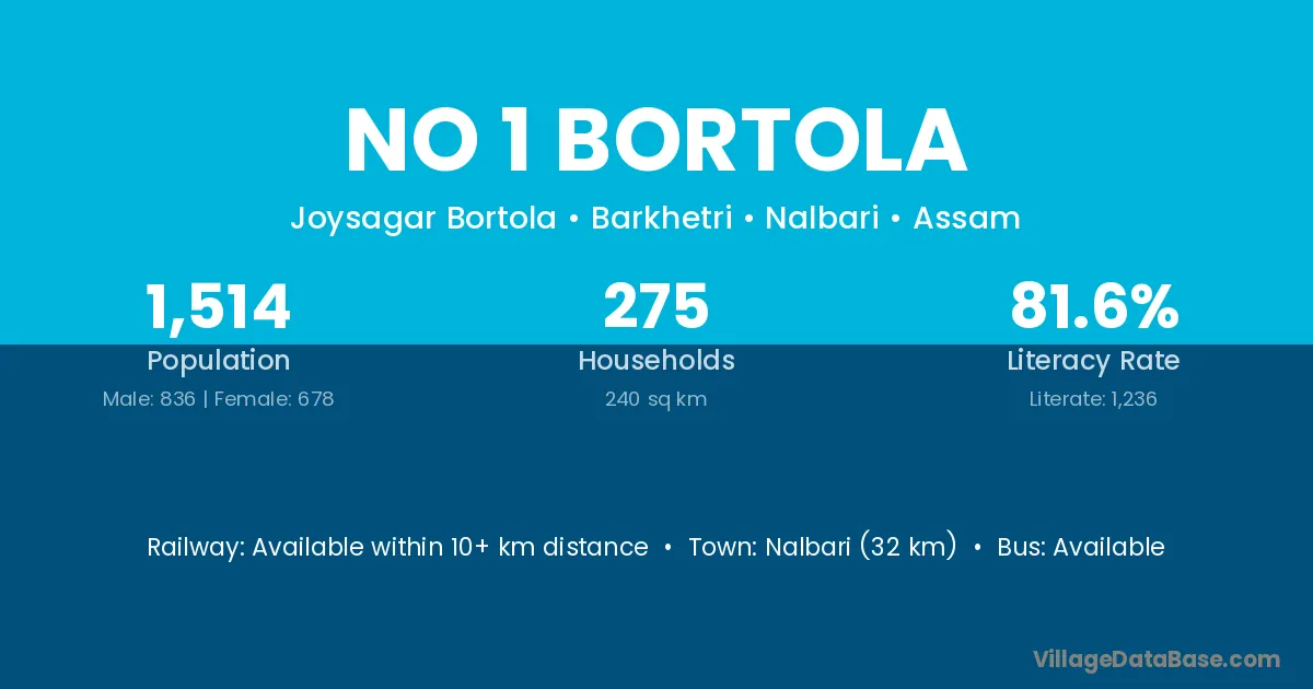 Nalbari (32 km) is the nearest town to No 1 Bortola village for major economic activities and is located approximately 32 km away.
