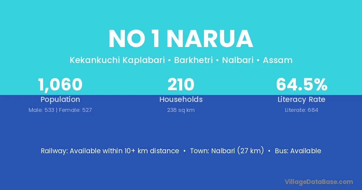 Nalbari (27 km) is the nearest town to No 1 Narua village for major economic activities and is located approximately 27 km away.