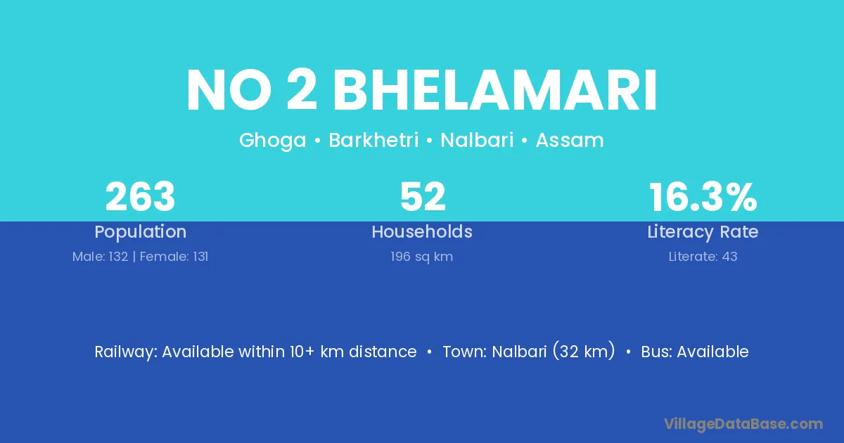 No 2 Bhelamari village has a total population of 263 people, of which 132 are males and 131 are females.