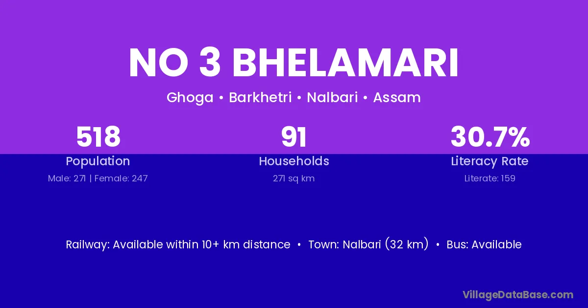 Nalbari (32 km) is the nearest town to No 3 Bhelamari village for major economic activities and is located approximately 32 km away.