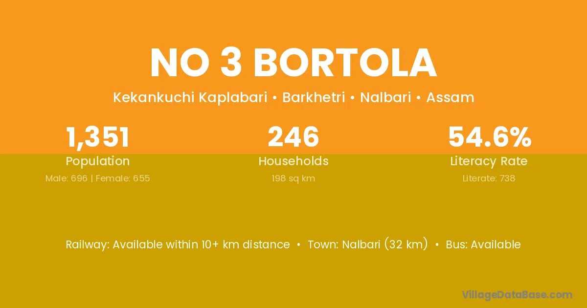 Nalbari (32 km) is the nearest town to No 3 Bortola village for major economic activities and is located approximately 32 km away.