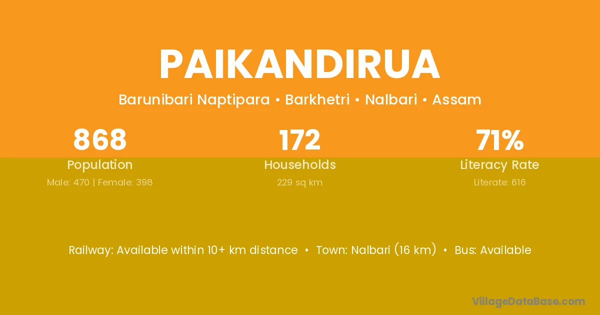 Nalbari (16 km) is the nearest town to Paikandirua village for major economic activities and is located approximately 16 km away.