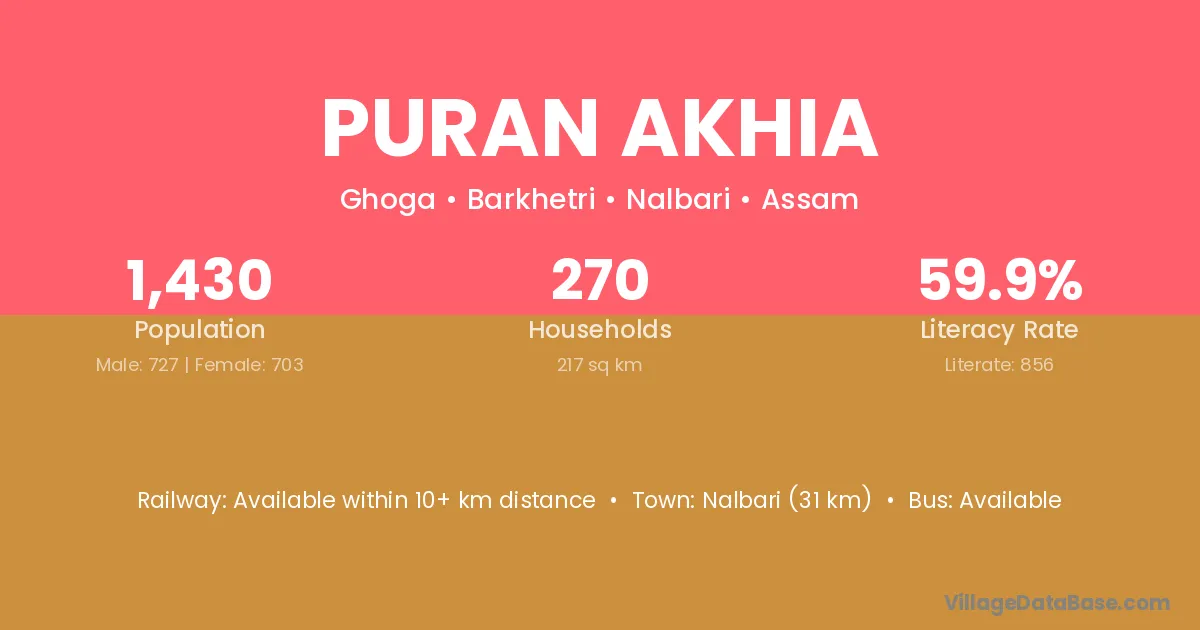 Nalbari (31 km) is the nearest town to Puran Akhia village for major economic activities and is located approximately 31 km away.
