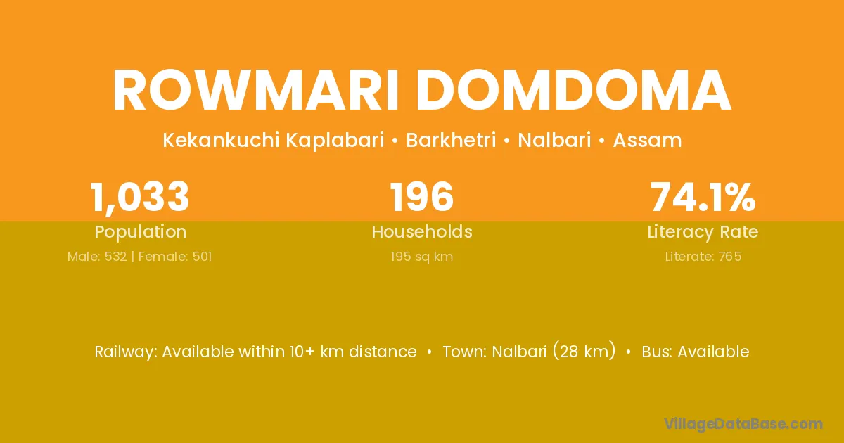 Nalbari (28 km) is the nearest town to Rowmari Domdoma village for major economic activities and is located approximately 28 km away.