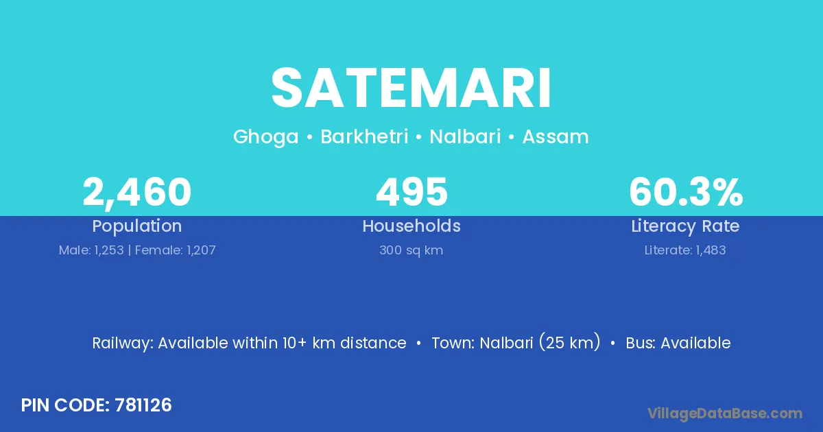 Nalbari (25 km) is the nearest town to Satemari village for major economic activities and is located approximately 25 km away.