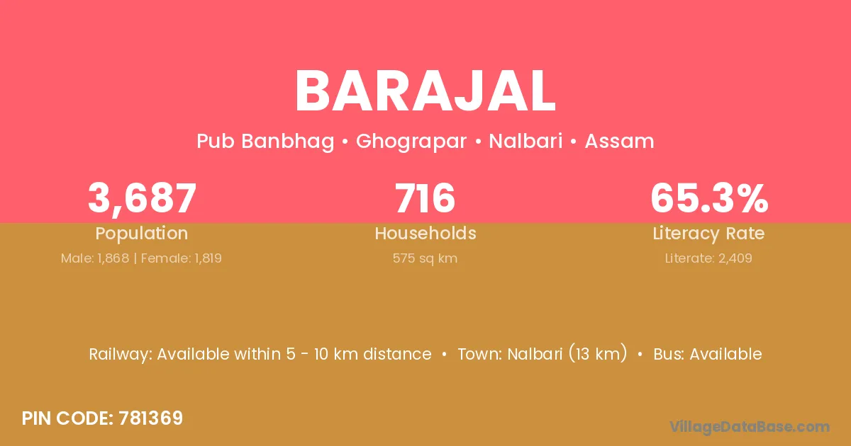 Nalbari (13 km) is the nearest town to Barajal village for major economic activities and is located approximately 13 km away.
