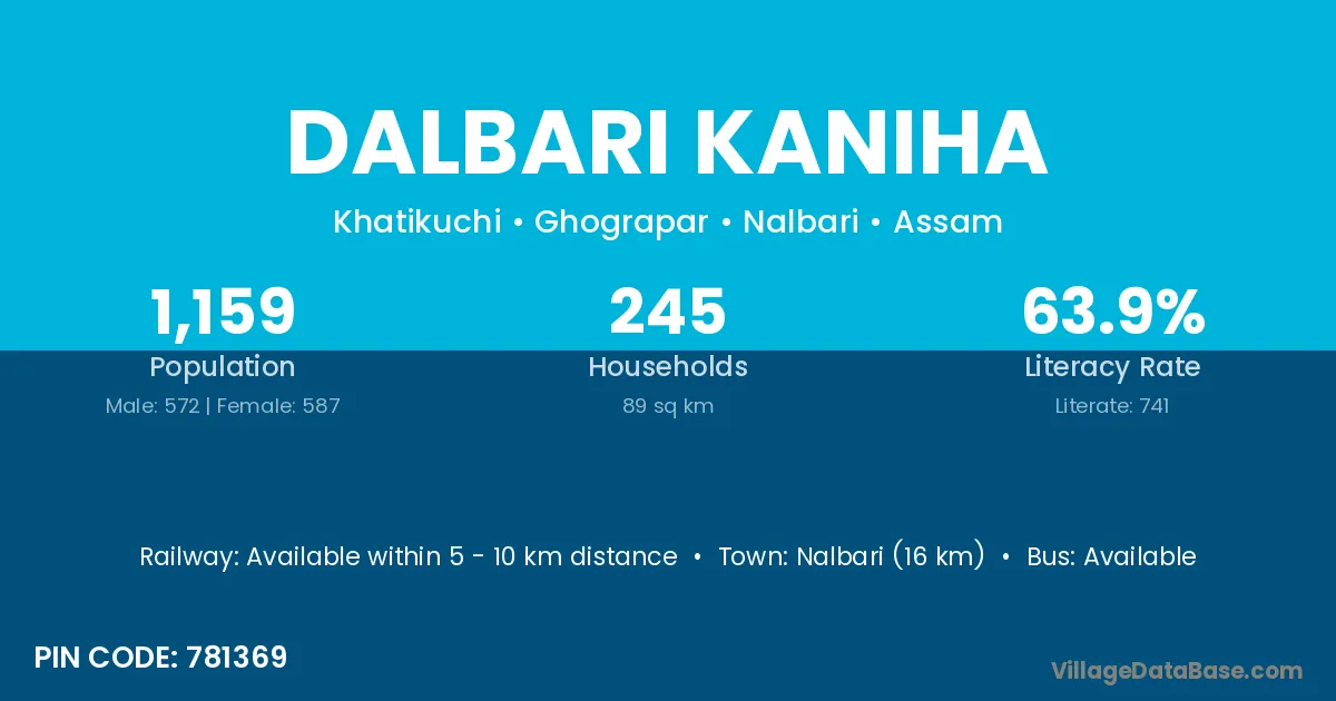 Nalbari (16 km) is the nearest town to Dalbari Kaniha village for major economic activities and is located approximately 16 km away.